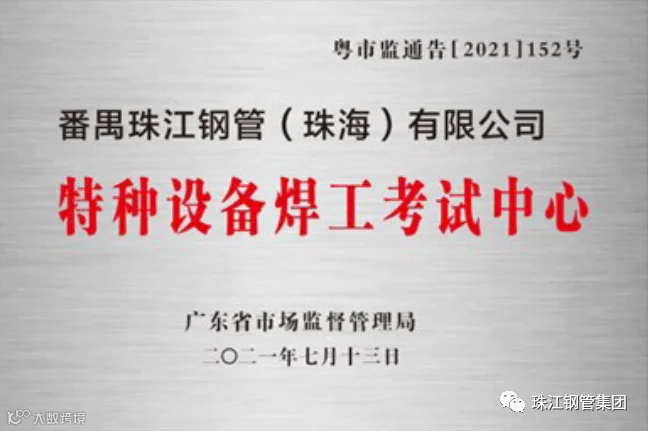番禺珠江钢管(珠海)有限公司焊工考试中心在公司领导的大力支持下,经过周密策划、有序组织,于2021年7月13日顺利通过了广东省市场监督管理局的资质审核,被列入广东省特种设备作业人员考核机构。