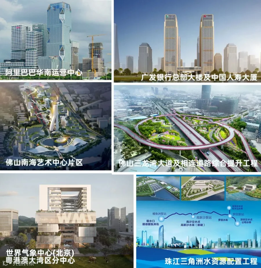 部分重点项目包括世界气象中心(北京)粤港澳大湾区分中心、珠江三角洲水资源配置工程、阿里巴巴华南运营中心、广发银行总部大楼项目及中国人寿大厦、广州市第六资源热力电厂、佛山南海艺术中心片区景观设计(南海之眼)、佛山三龙湾大道及相连道路综合提升工程、佛江高速公路和顺至陈村段、东莞滨海湾新区东湾大道跨太平水道桥、大观净水厂及广东省揭阳监狱“十二五”基础设施建设项目等。