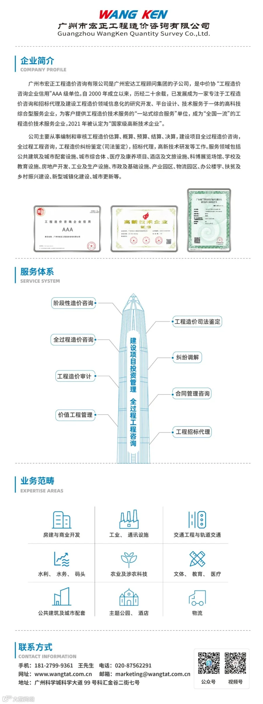 广州市宏正工程造价咨询有限公司是“工程造价咨询企业信用”AAA级单位,自2000年成立以来,历经二十余载,已发展成为一家专注于工程造价咨询和招标代理及建设工程造价领域信息化的研究开发、平台设计、技术服务于一体的高科技综合型服务企业,为客户提供工程造价技术服务的“一站式综合服务”单位,并致力于成为“华南领先、全国一流”的工程造价技术服务企业。