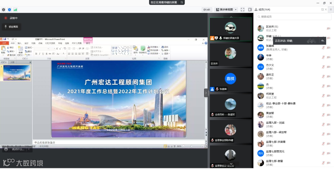 上周末,广州宏达工程顾问集团举办了集团2021年度工作总结暨2022年工作计划会议,会议主会场设在集团总部宏达建投大厦,集团董事长黄沃、集团董事兼总裁张萌、全咨与代建事业部、工程咨询与设计事业部、工程监理事业部、工程采购及造价咨询事业部、科博文展事业部、经营合同管理中心、行政及体系管理中心、财务管理中心、宏达研发中心的主要负责人参加会议。全程采用“线下会议+云直播”模式,通过直播与宏达分布在全国各地的项目部代表联动,总结一年收获,探讨未来发展。