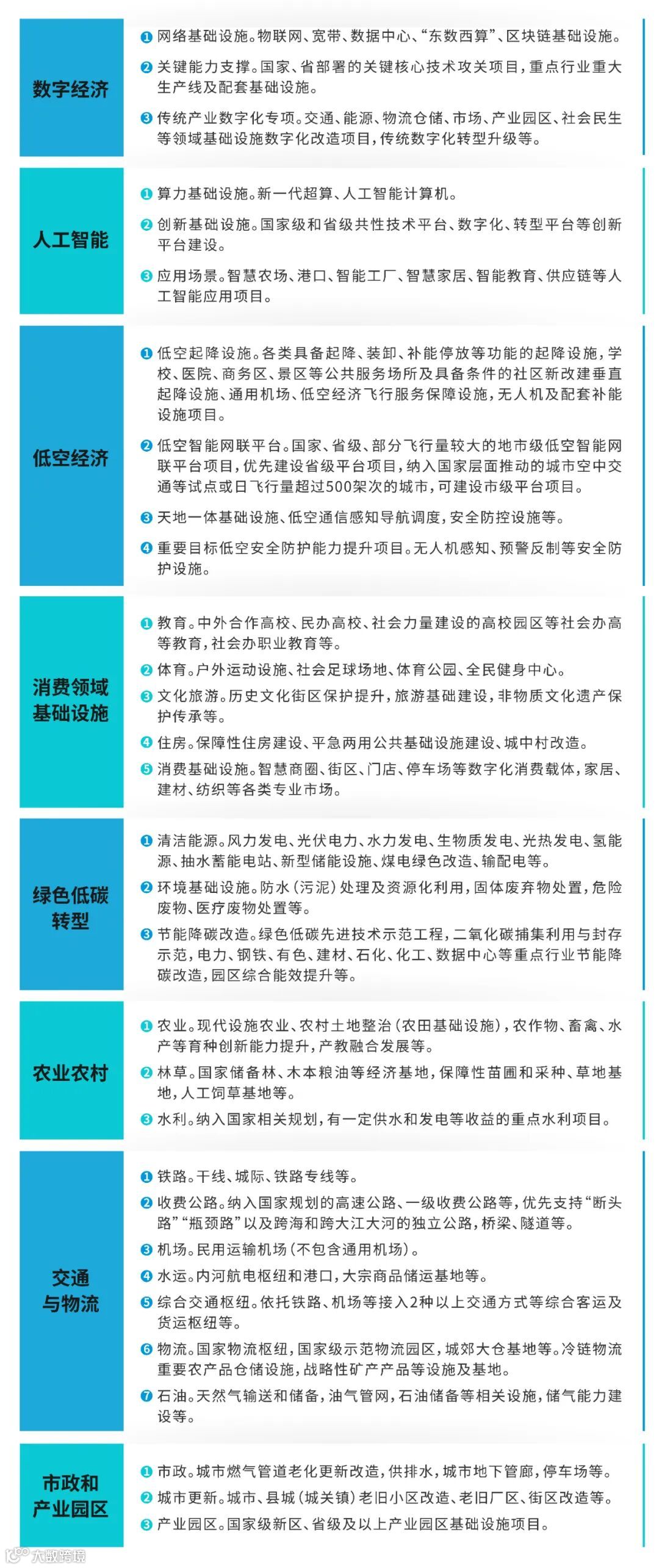 本轮新型政策性金融工具主要聚焦数字经济、人工智能、低空经济、消费基础设施(文旅、体育)、绿色低碳、农业农村、交通物流、市政园区等8个领域31个专业: