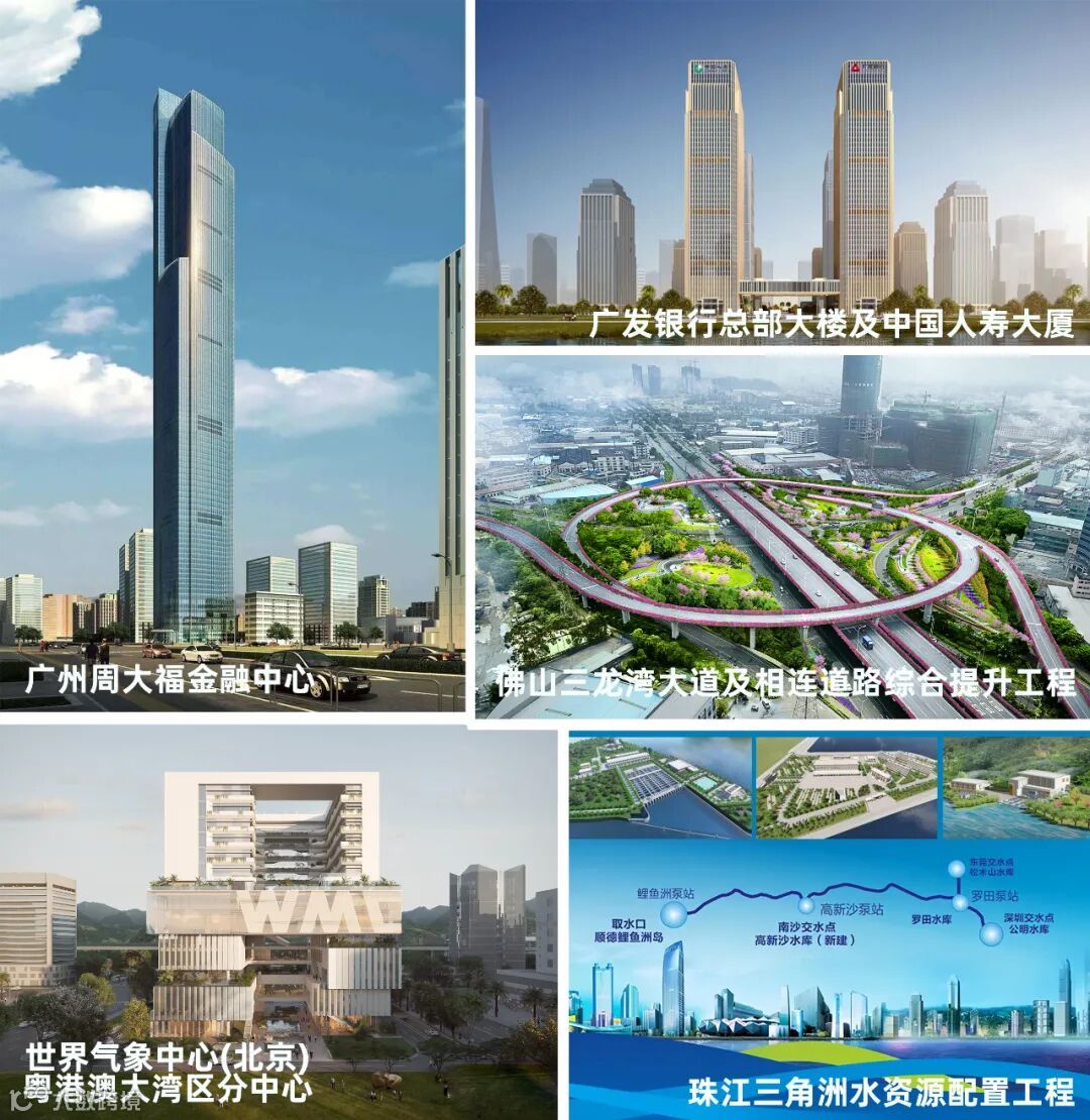 部分重点项目包括世界气象中心(北京)粤港澳大湾区分中心、珠江三角洲水资源配置工程、阿里巴巴华南运营中心、广发银行总部大楼项目及中国人寿大厦、广州市第六资源热力电厂、佛山南海艺术中心片区景观设计(南海之眼)、佛山三龙湾大道及相连道路综合提升工程、佛江高速公路和顺至陈村段、东莞滨海湾新区东湾大道跨太平水道桥、大观净水厂及广东省揭阳监狱“十二五”基础设施建设项目等。