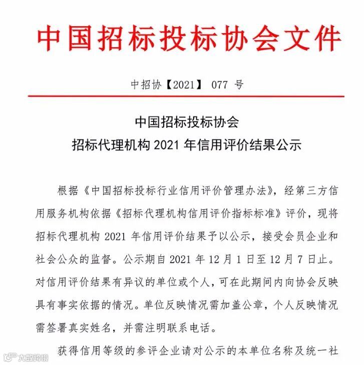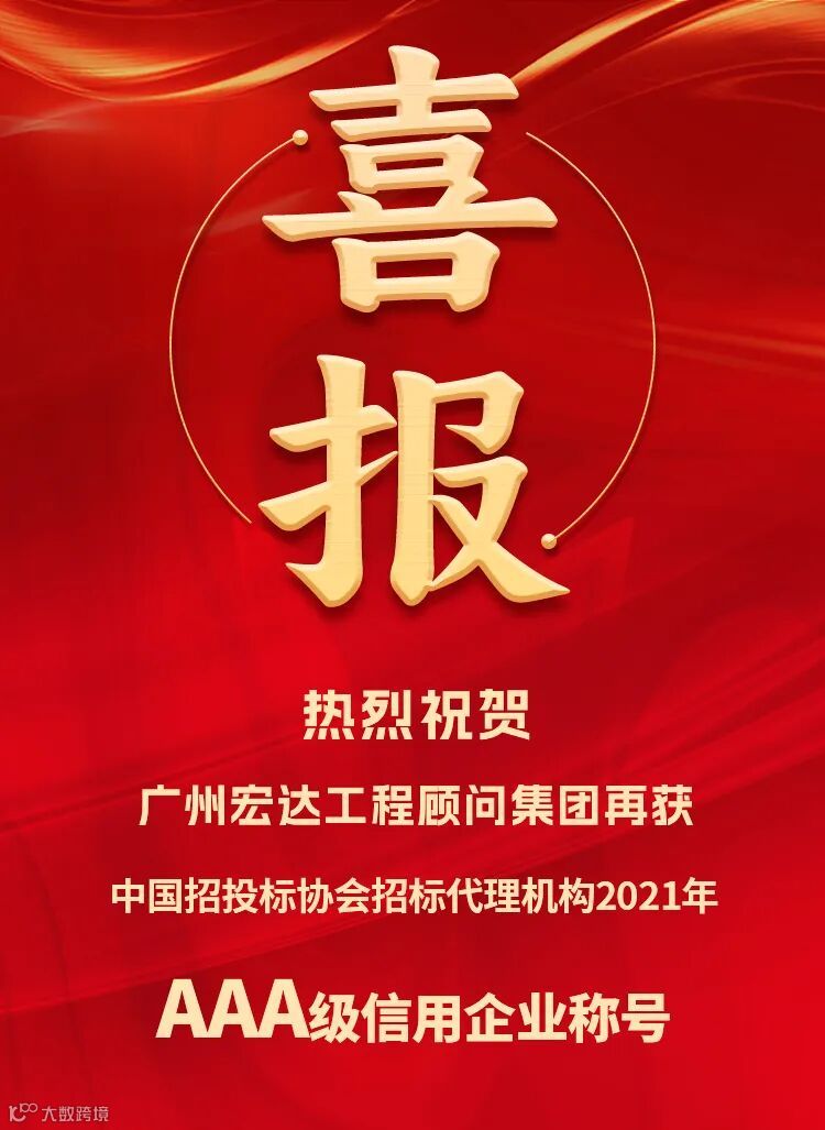 日前,广州宏达工程顾问集团荣获中国招标投标协会招标代理机构2021年AAA级信用企业称号,这是由中国招标投标协会对企业进行诚信评定和综合考察的评级。宏达自2016年中国招标投标协会开展行业信用评价工作以来,连续获得中国招标代理行业企业信用最高评级。