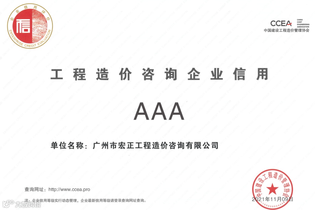 近日,广州市宏正工程造价咨询有限公司(以下简称:广州宏正造价公司)获评为中国建设工程造价管理协会“工程造价咨询企业信用”AAA级,这是广州宏正造价公司连续第三次获得这一中国工程造价咨询行业最高诚信等级。