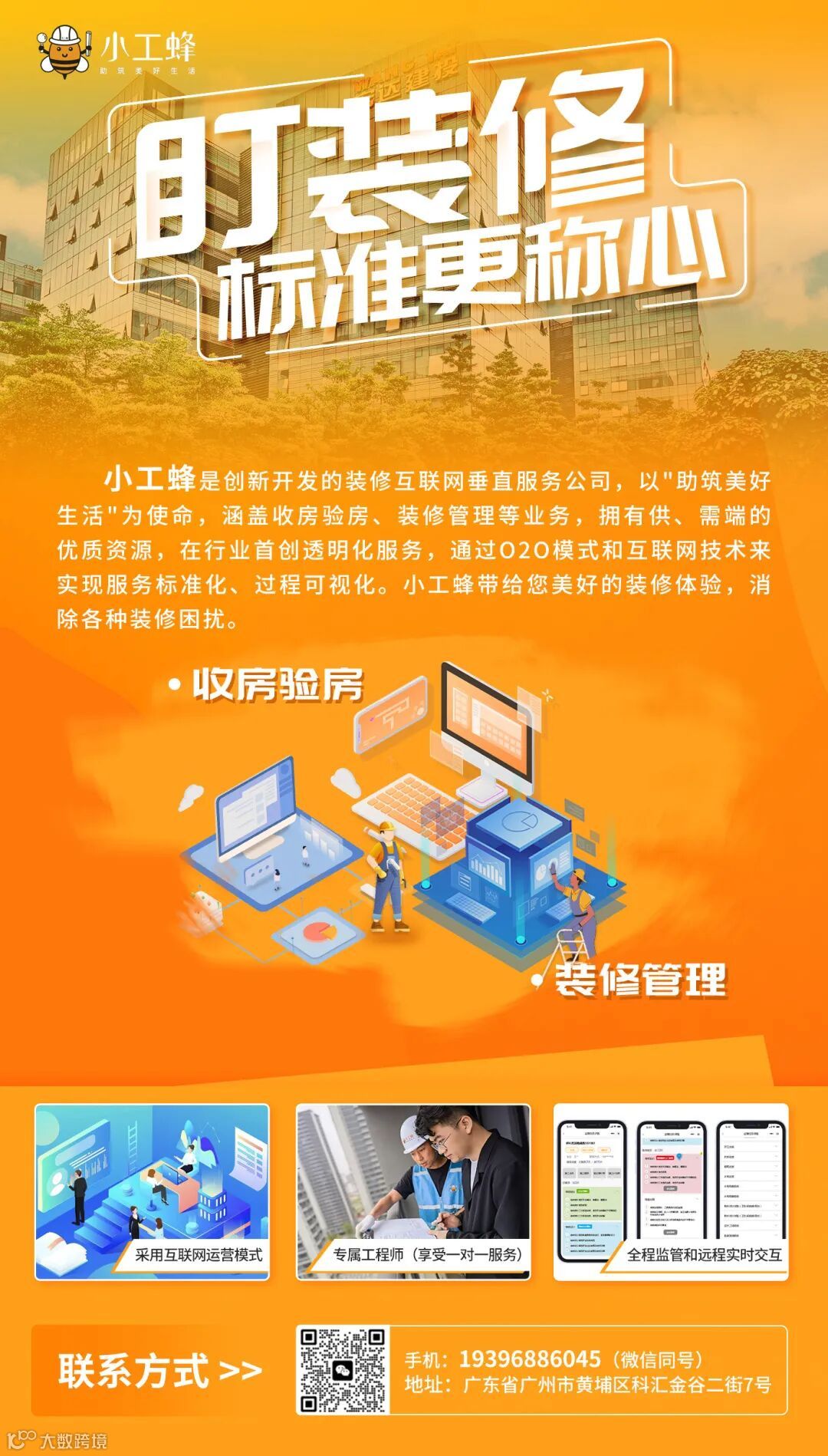 小工蜂隶属中国知名的综合性工程咨询、管理及技术服务企业——广州宏达工程顾问集团,作为全过程工程咨询专家和智慧建造管理平台,已为海内外万项工程提供全生命周期服务管理。小工蜂是创新开发的装修互联网垂直服务公司,采用互联网运营模式,全流程标准化操作,实现了全程监管和远程实时交互,解决了客户“不懂装修,无暇监管”的痛点。同时拥有供、需端的优质资源,在行业首创透明化服务,通过O2O模式和互联网技术来实现服务标准化、过程可视化,做到服务到位、品质把控。