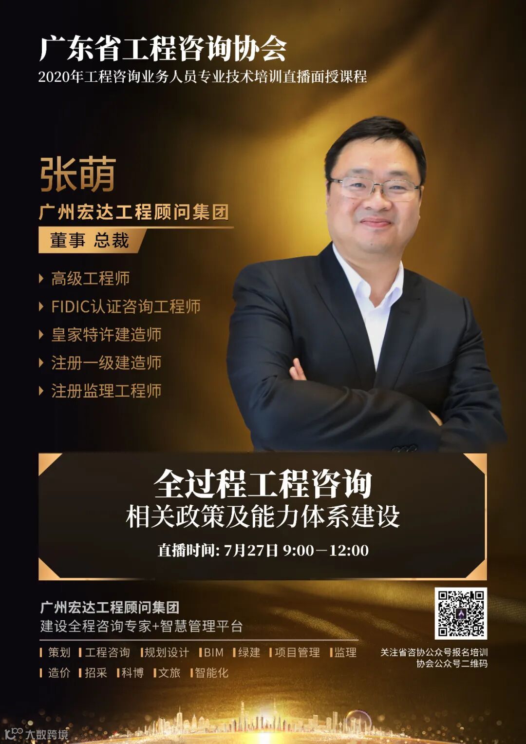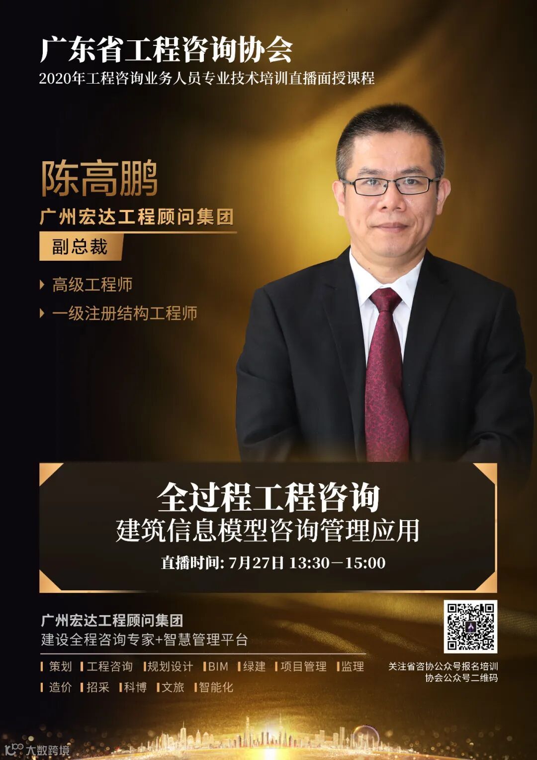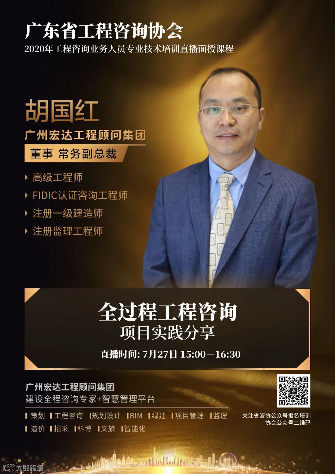 近日,由广东省工程咨询协会组织的2020年工程咨询业务人员专业技术培训直播正在火热进行中。来自宏达学院的三位导师、广州宏达工程顾问集团的资深工程咨询专家也将在7月27日于培训直播间与报名参加培训交流的学员们见面,按照广东省工程咨询协会发起的“全过程工程咨询”专题,带来《全过程工程咨询相关政策及能力体系建设》、《全过程工程咨询建筑信息模型咨询管理应用》、《全过程工程咨询项目实践分享》三门精品课程。