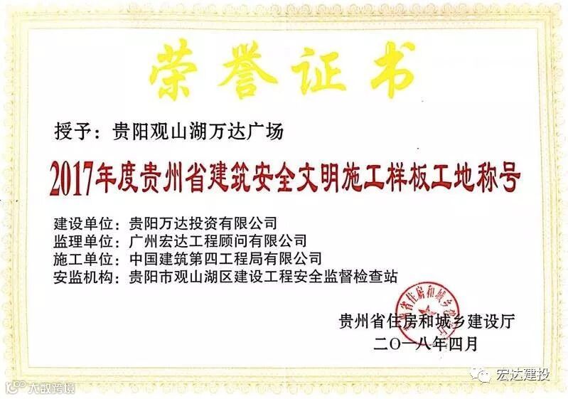 日前,由广州宏达工顾问有限公司提供建设管理服务的贵阳观山湖万达广场项目荣获“2017年度贵州省建筑安全文明施工样板工地”荣誉称号。这是该项目继2017年获得贵阳市住房和城乡建设局颁发的“贵阳市2017年度建筑安全文明施工样板工地”称号后的又一荣誉。