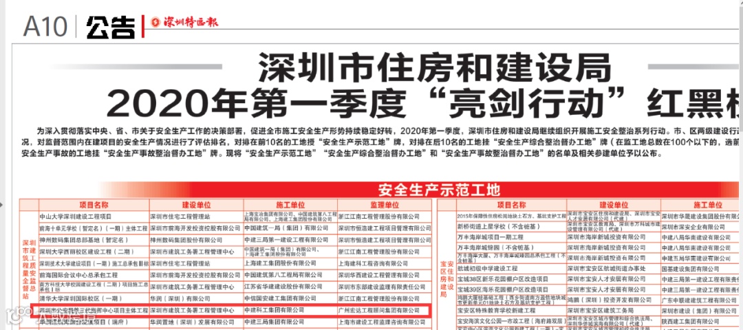 近日,深圳市住建局2020年第一季度“亮剑行动”红榜正式发布,由广州宏达工程顾问集团提供全过程工程咨询服务的深圳市第三代指挥中心项目再获“安全生产示范工地”,这是继2019年第四季度上榜后再登红榜前十名。