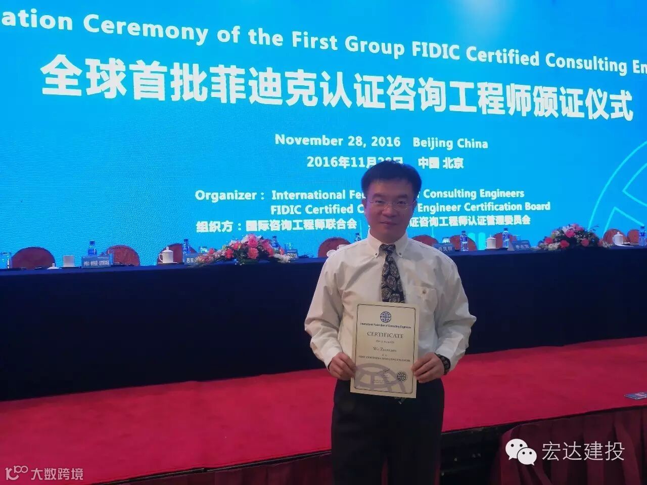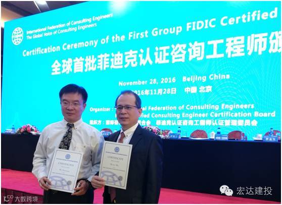 喜报 11月28日,全球首批菲迪克FIDIC(国际咨询工程师联合会)认证咨询工程师颁证仪式在北京隆重举行。广东宏达建投控股集团董事长黄沃(上图右)、广州宏达工程顾问有限公司总经理伍忠民(上图左)等一批中国优秀咨询工程师上台接受了证书。