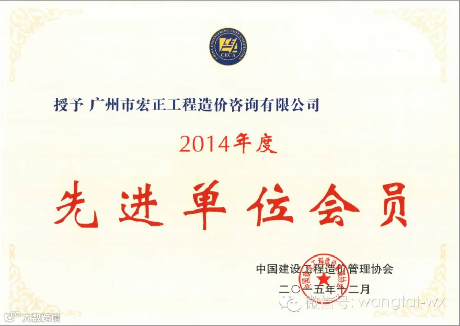 广州市宏正工程造价咨询有限公司荣获中国建设工程造价管理协会”2014年度先进单位会员”称号。
