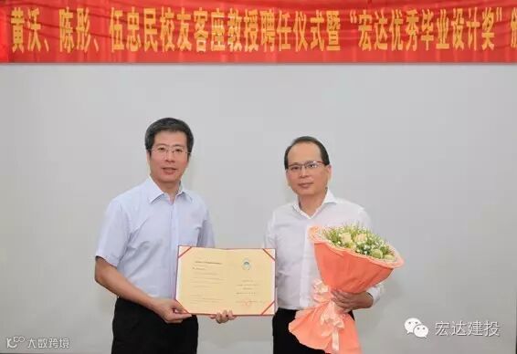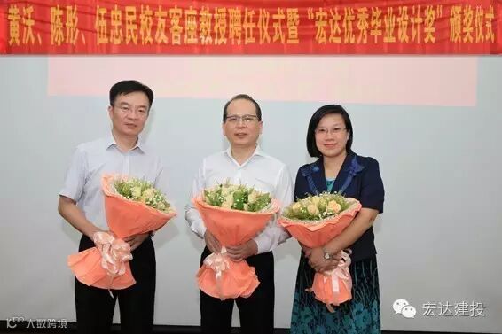 6月14日下午,宏达建投集团董事长黄沃、执行董事陈彤,宏达公司总经理伍忠民受聘为华南理工大学土木与交通学院客座教授的聘任仪式暨“宏达优秀毕业设计奖”颁奖仪式在华南理工大学7号楼学术报告厅简单而隆重举行。华南理工大学校长助理、土木与交通学院院长苏成教授、行政副院长李美春、以及师生们出席了会议。