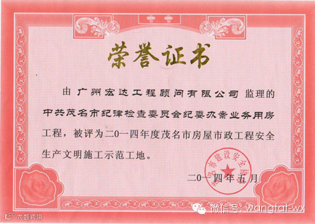 由广州宏达工程顾问有限公司提供监理服务的“中共茂名市纪律检查委员会纪委办案业务用房工程”,荣获得“二0一四年度茂名市房屋市政工程安全生产文明施工示范工地”称号。