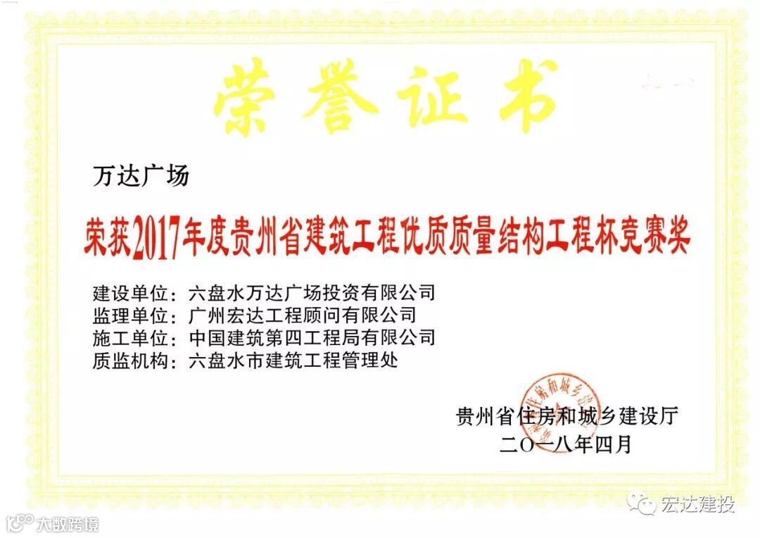 日前,由广州宏达工程顾问有限公司提供建设管理服务的六盘水万达广场项目荣获2017年度“贵州省建筑安全文明施工样板工地”和“贵州省级建筑工程优质质量结构工程杯竞赛奖”。