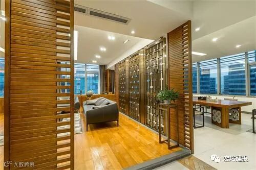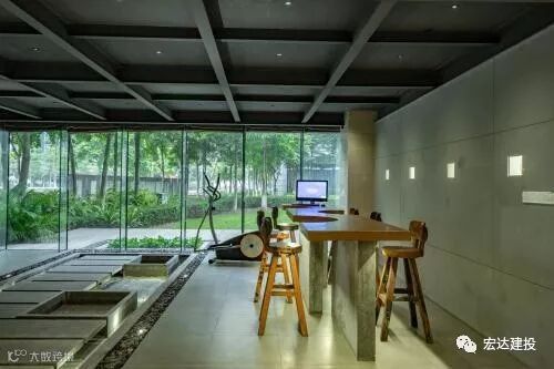 大楼的室内装修设计采用现代简约风格,利用空间重塑来区分不同的办公区域,以及通过引入室外景观提升办公生态环境。一楼大厅是建筑重要的公共空间,在这里,对钢结构的运用可以唤起人们对工程特质的强烈感受;南北双向的落地玻璃窗,最大限度地引入了室外的草坪、灌木、树木等错落有致的园林景观,并与室内的地表水池、水面步道相结合,形成室内外相融的生态感知,提高工作期间的人体舒适度,体现生态优化的精神。在会议室、接待室等商务环境,则大量运用木材,配以暖色照明系统,与一楼的工业感形成对比,并为会议的商务气氛注入文化情感。