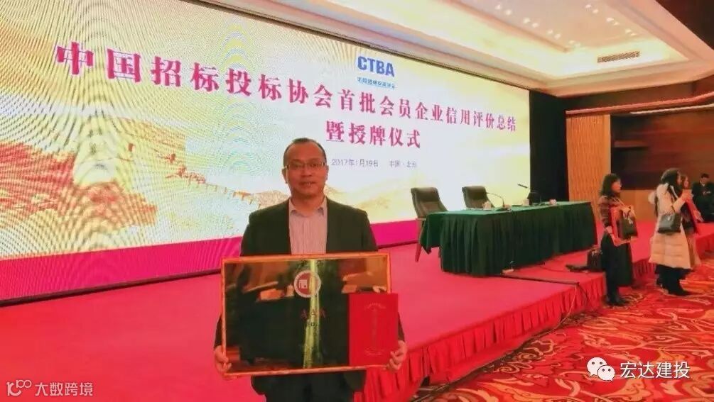 1月19日,中国招标投标协会首批会员企业信用评价总结暨授牌仪式在京举行。广州宏达工程顾问有限公司成为协会首批招标代理机构信用评价最高AAA级企业,为该评价的最高等级。公司副总经理胡国红代表宏达公司领奖。