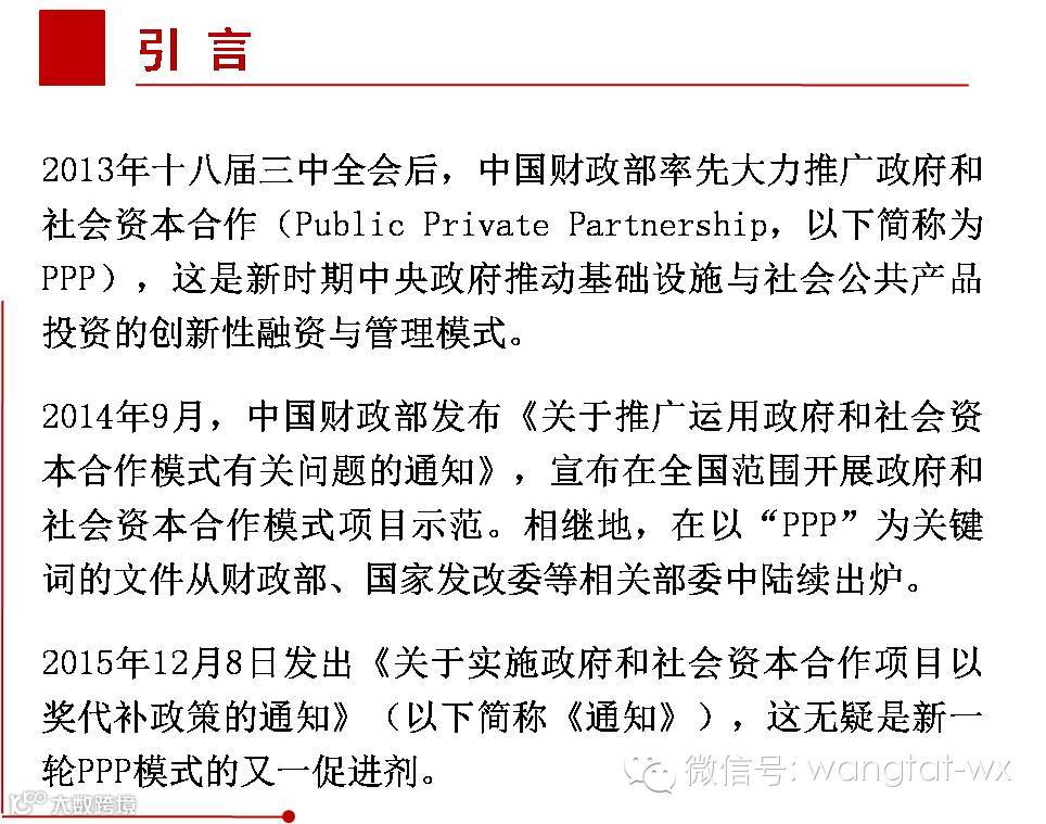 如果说中央高层多次提及PPP,充分表明中央政府对发展PPP模式的重视和推广这一模式的力度与决心,那么该《通知》以及不久前财政部出台的《PPP项目政府采购管理办法》等一系列政策法规则在为扎实推进PPP模式确定正确轨道,营造健康环境,注入活力促进剂。可以预见,伴随PPP立法准备工作的重新启动,PPP模式新的发展契机已经来临。我们不能只有胃口,还要对号入座,有合适的肌体,有足够的消化能力、吸收与转换能力。