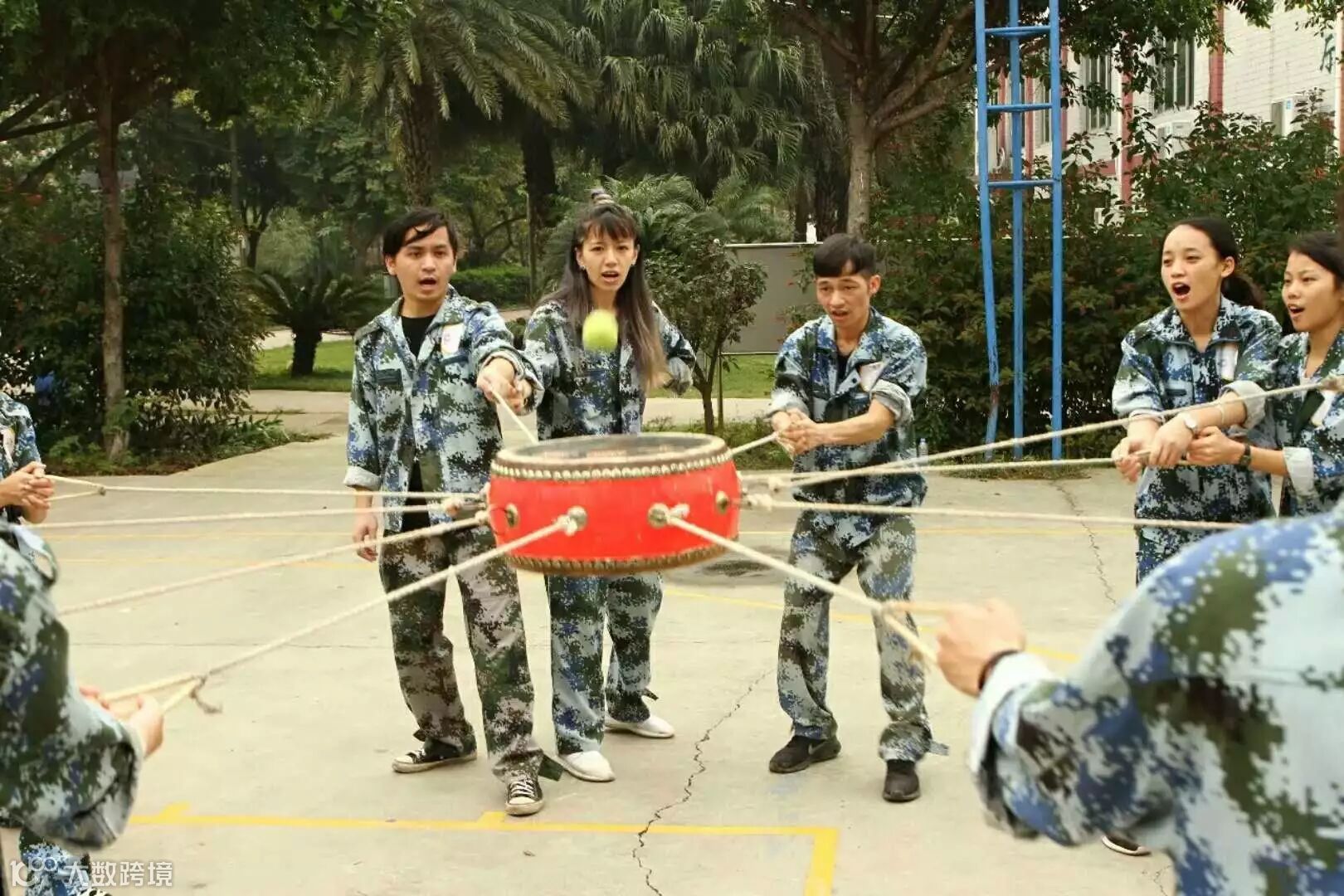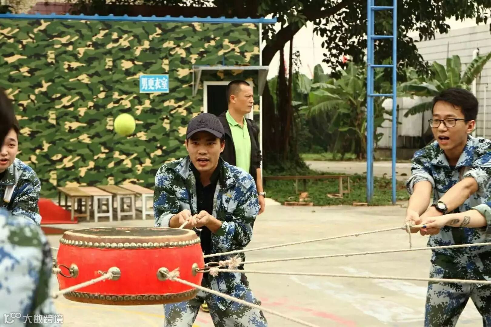 将一个排球放在鼓面上,