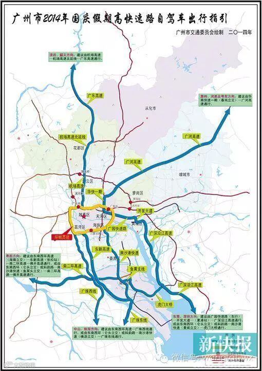 今年国庆免费通行时间为10月1日零时至10月7日24时。预计今天中午至10月1日为出行高峰,10月7日为返程高峰。特别提醒,国庆期间北环高速广北桥路段、东南西环高速三滘路段、北二环高速聚龙大桥路段施工抢修,建议车主绕行以避免拥堵。市交委优选自驾车出行路线: