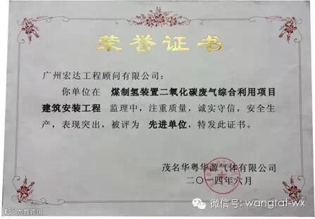 宏达公司为“煤制氢装置二氧化碳废气综合利用项目建筑安装工程”提供监理服务,注重质量,诚实守信,安全生产,表现突出,被业主单位“茂名华粤华源气体有限公司”评为“先进单位”。