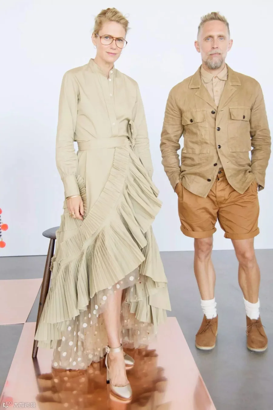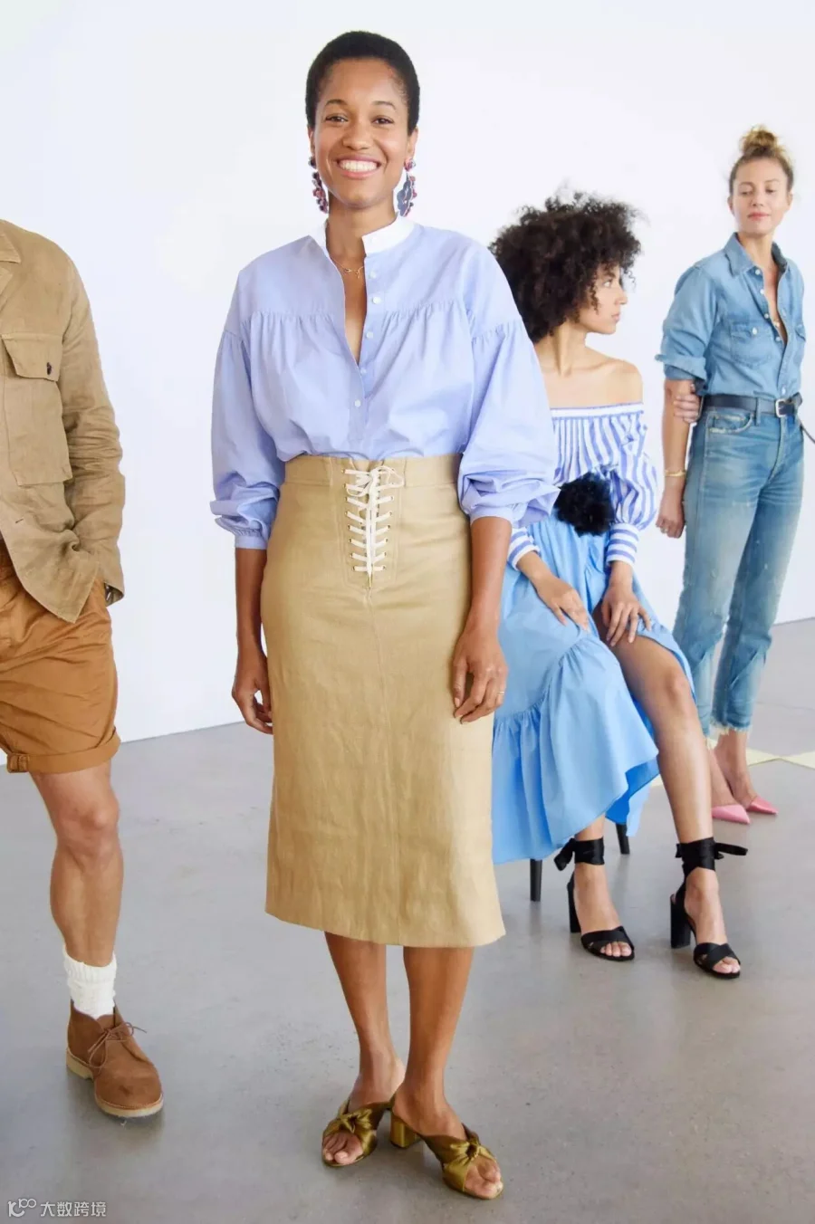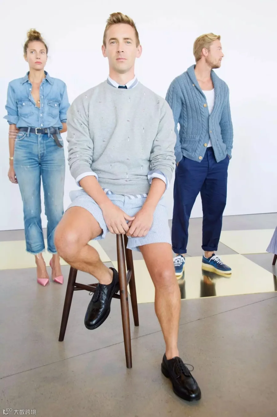 这些素人模特都是J.Crew自己的员工及其家人和朋友,他们的年龄从13岁到72岁不等,男女老少都有,甚至还有一个是怀孕7个月的准妈妈(下图穿蓝色连体裤的俏皮女),整支队伍看上去简直就是J.Crew一部完整的产品目录啊。别的片场都是名模相见,各种合照寒暄,而这一群人拖家带口,见了朋友抱一抱,话话家常,喝喝水,逗逗孩子,完全是另一种画风。