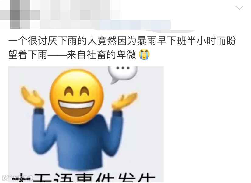 与此同时,一群社畜正在角落里暗暗窃喜,本来大暴雨是一件挺可怕的事儿,结果愣是因为社畜不上班,快乐似神仙,把气氛烘托到位了。
