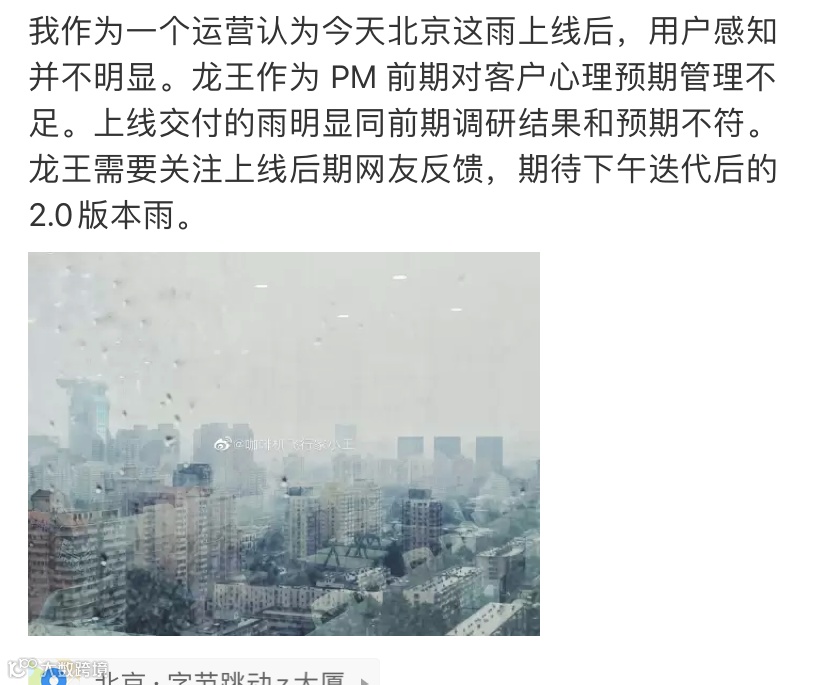 这部有关北京暴雨的连续剧,从预热开始就声势浩大,全网关注。经历了社畜不上班、雨有多大、全民等雨、雨的压力、龙王文学、真心错付等几集之后,在昨天深夜以大暴雨结束。