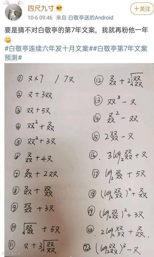 而今年是第六年,白敬亭的十月文案是3√叕,居然用到了算术平方根,又、又又、叒、叕、又+双²、3√叕......