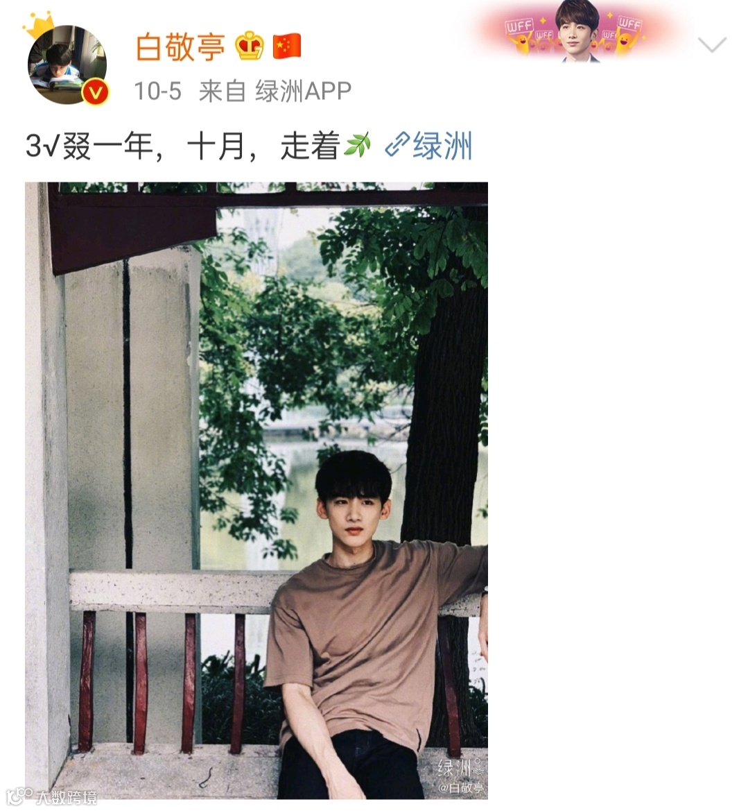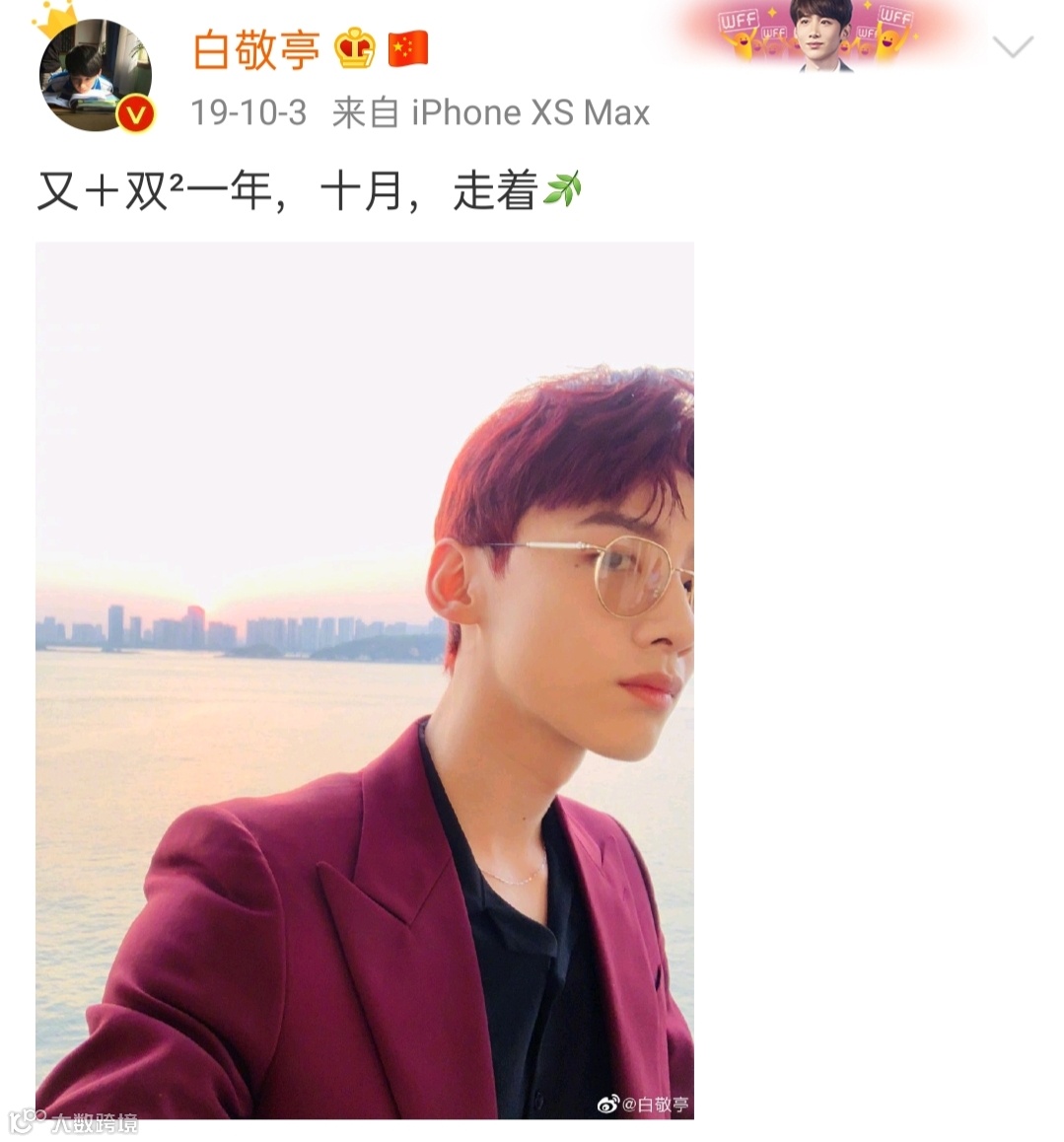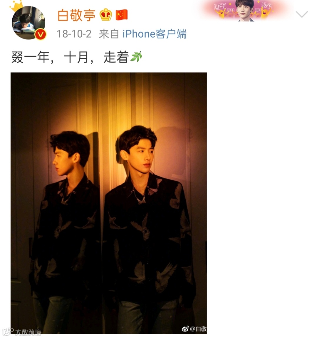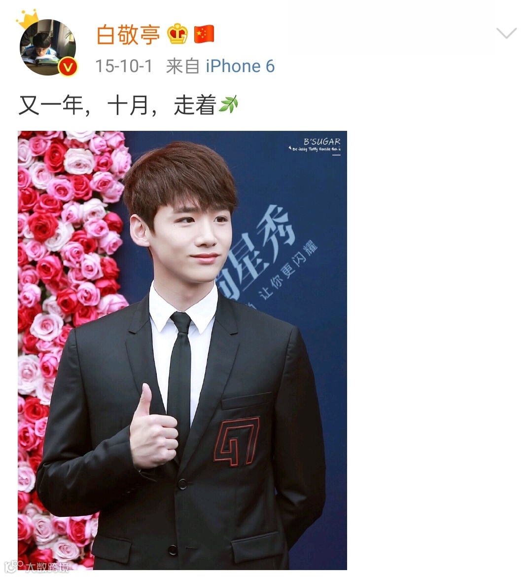 自2015年开始,每年的十月初,白敬亭都会发一条微博,文案的内容相似,只是每年都会多一不能个“又”字,前四年的文案用上了又双叒叕。