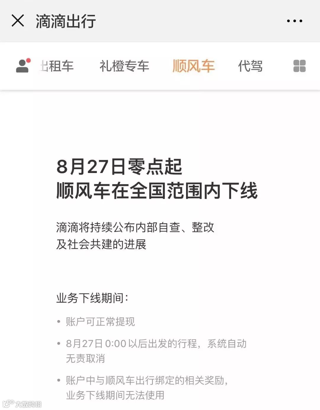 滴滴宣布:下线顺风车业务
