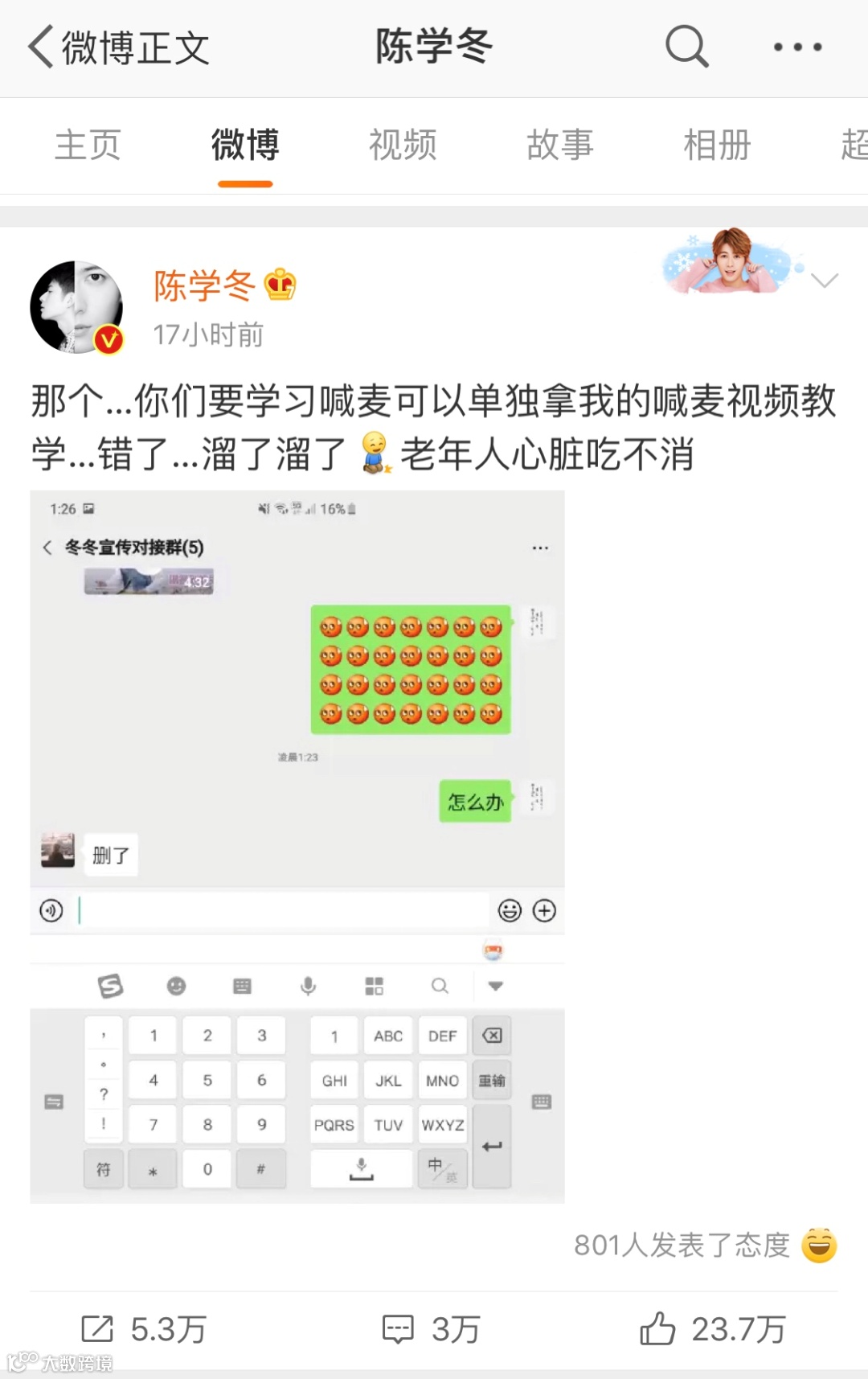 然后陈学冬点开,看完自己的部分