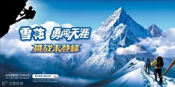 “雪花勇闯天涯”活动已经走进第十个年头,从雅鲁藏布大峡谷,探索长江源,远征国境线,到极地探索,挑战乔戈里,共攀长征之巅;从穿越可可西里,冲破雪线,到翻越喜马拉雅,雪花啤酒一直以独特的活动个性体现着勇闯天涯品牌理念,在“啤酒文化”上也独树一帜。此次“挑战未登峰”活动,除了登顶,更重要的是将这座从未登顶之峰命名,并结合线上的极限运动、直播赛事、冬奥会和世界杯。在啤酒行业竞争日趋激烈,雪花啤酒通过户外、旅游、极限挑战类主题活动,打造个性品牌。