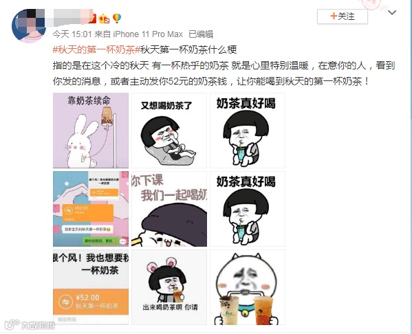 2、一般情侣之间发秋天第一杯奶茶红包的比较多