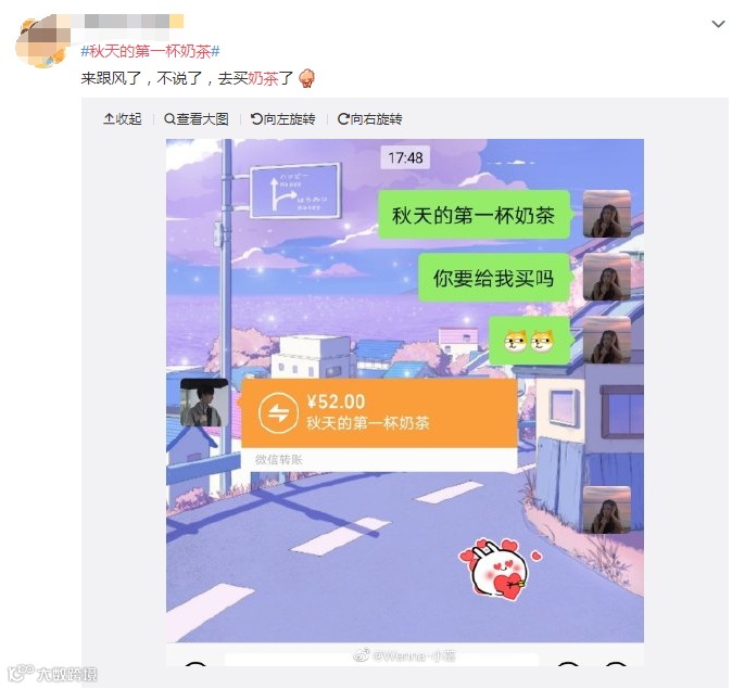 1、就是借着秋天来了要了杯奶茶的红包