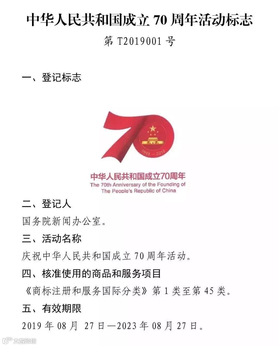 2019年6月3日,国务院新闻办公室发布庆祝中华人民共和国成立70周年活动标识 。9月4日,国家知识产权局依据《特殊标志管理条例》对国务院新闻办公室提交的“中华人民共和国成立70周年活动标志”的特殊标志登记申请予以核准 。