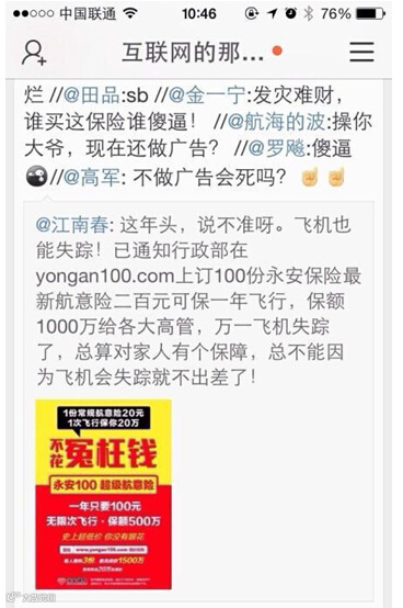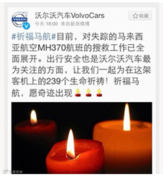 2014年最让人心痛的事件莫过于此,3月8日凌晨1时20分,由马来西亚飞往北京的马来西亚航空公司MH370航班与地面失去联系,机上239人中包括153名中国大陆乘客全部失踪。这一事件虽得到了世界范围的关注,但仍未有妥善的解决。作为国内社交平台,微博微信在整个事件中给予了充分的舆论导向,一时间有关失联的话题炸开了锅,虽然大多数企业都是在祈祷祝福,但也有一些无节操的企业用来做营销,真心是无脑至极!