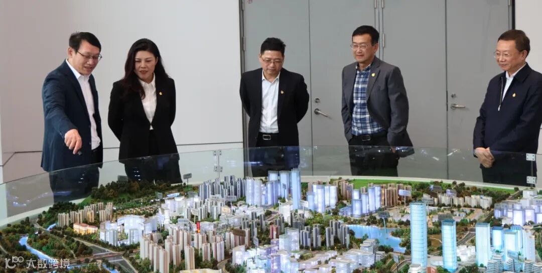 (来恩生物首席执行官彭晓明博士向广州产投董事长罗俊茯一行介绍中新知识城周边生物医药产业规划及布局)