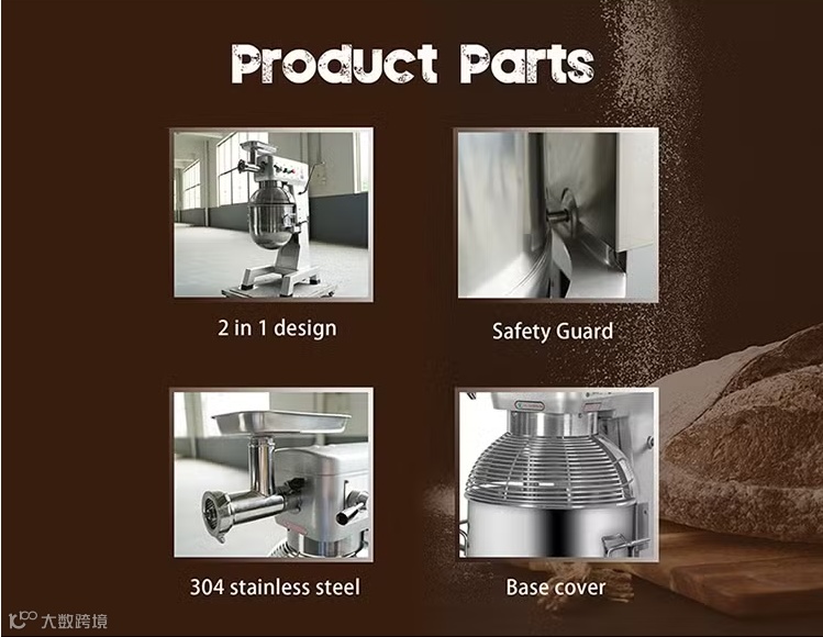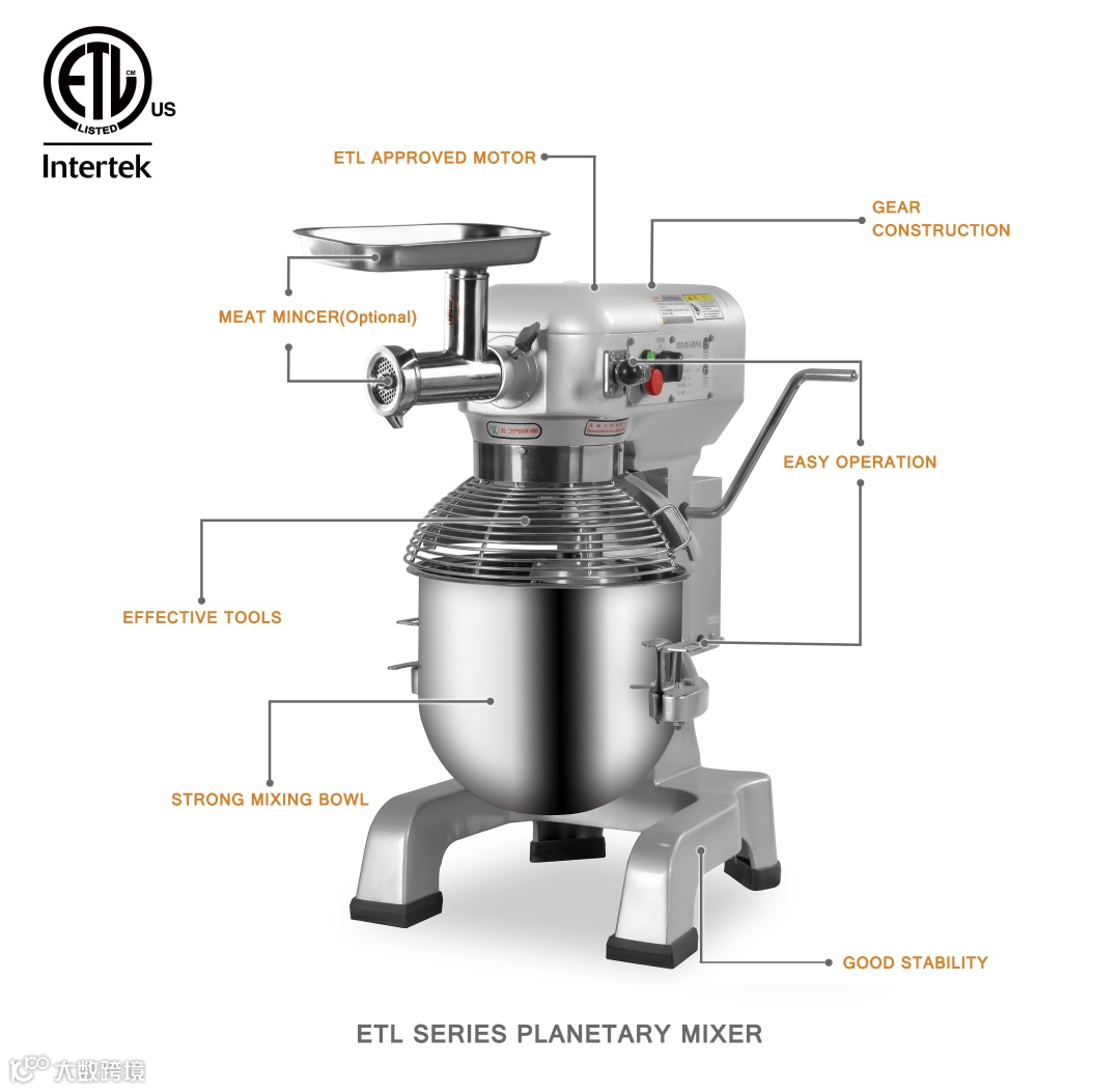J-series planetary mixers/food mixer is functioned with strong gear construction certified by ETL authentication. Each single electric spare part is approved of UL standard. Models size cover 10 liter, 20&30 liter, with optional meat grinder attachment in 304 stainless steel food hygiene approval. Multifunctional J-series also comes with complete strong aluminum hook & beater, 304 stainless steel mixing whisks in three different speed levels for better bakery process. Safety protection system and easy operation functions satisfy customers in North American market.
