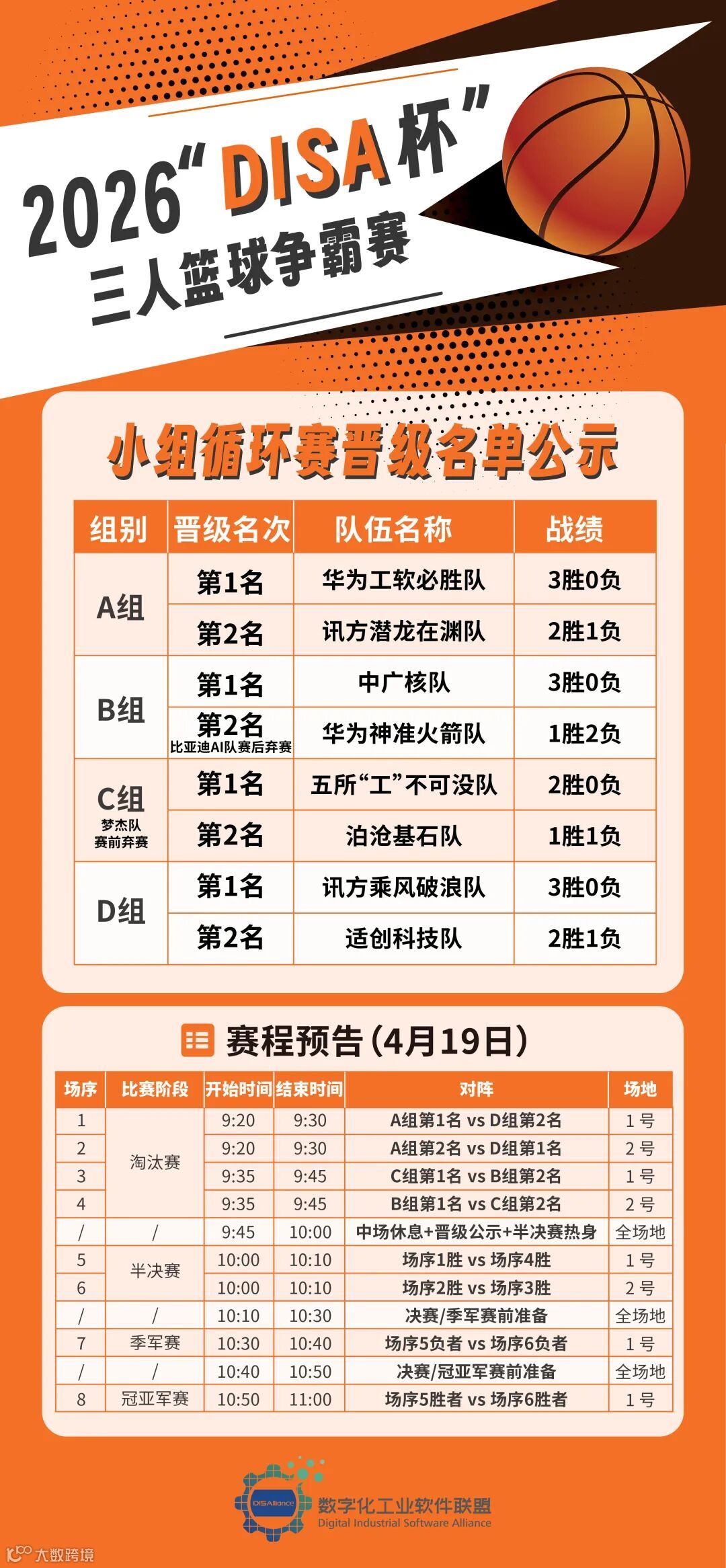 4月12日,2026“DISA杯”三人篮球争霸赛小组循环赛圆满收官!经过多轮激烈对决,四个小组前两名脱颖而出,强势晋级八强。