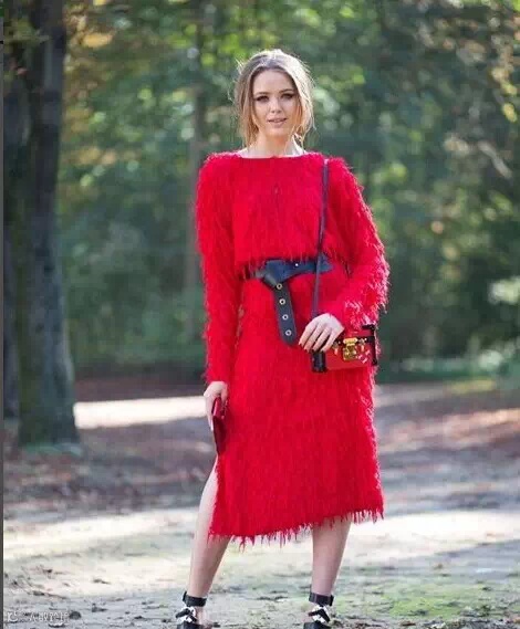 流苏元素持续发光发热,腰带、包带、鞋带的统一颜色带来完美比例。包包来自路易威登。