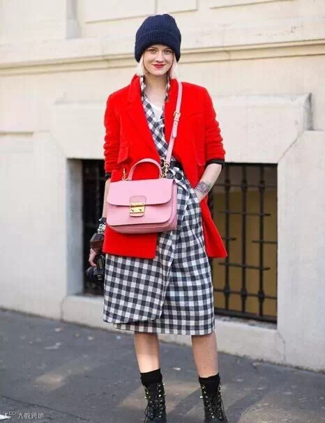 格子裙、粉挎包与红色外套的组合有点乖、有点坏、有点潮。包包来自Miu Miu。