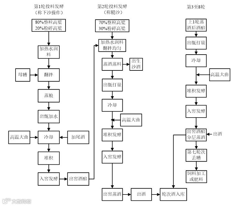酱香型白酒经过八轮次发酵,七次摘酒。不同轮次的酒风味和口感不同,糙沙完成后的第一轮次酒称为一次酒,甜味好,但味冲,生涩味和酸味重;再发酵30天出来的酒是二次原酒,称为“回沙酒”,略有涩味,但较糙沙酒醇和;再发酵蒸馏获得三、四、五次原酒,统称为大回酒,其特点香浓、味醇厚、酒体较丰满、杂味少;继续发酵蒸馏获得六次原酒,此酒醇和、糊香好、味长;还有七次原酒,称为糟酒。