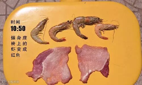 记者做了实验,放上去的生虾半个小时就烤熟了,而两片猪肉也到了5分熟的标准!