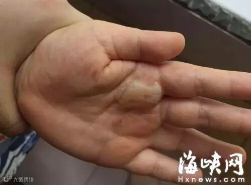 7月1日晚上,福州的黄女士带着儿子准备回家。“我拎着东西,儿子在前面冲。”黄女士说,结果她儿子一不小心跌倒,手本能地摁在地面上,没想到被烫得哇哇叫,没过一会儿就起泡了。