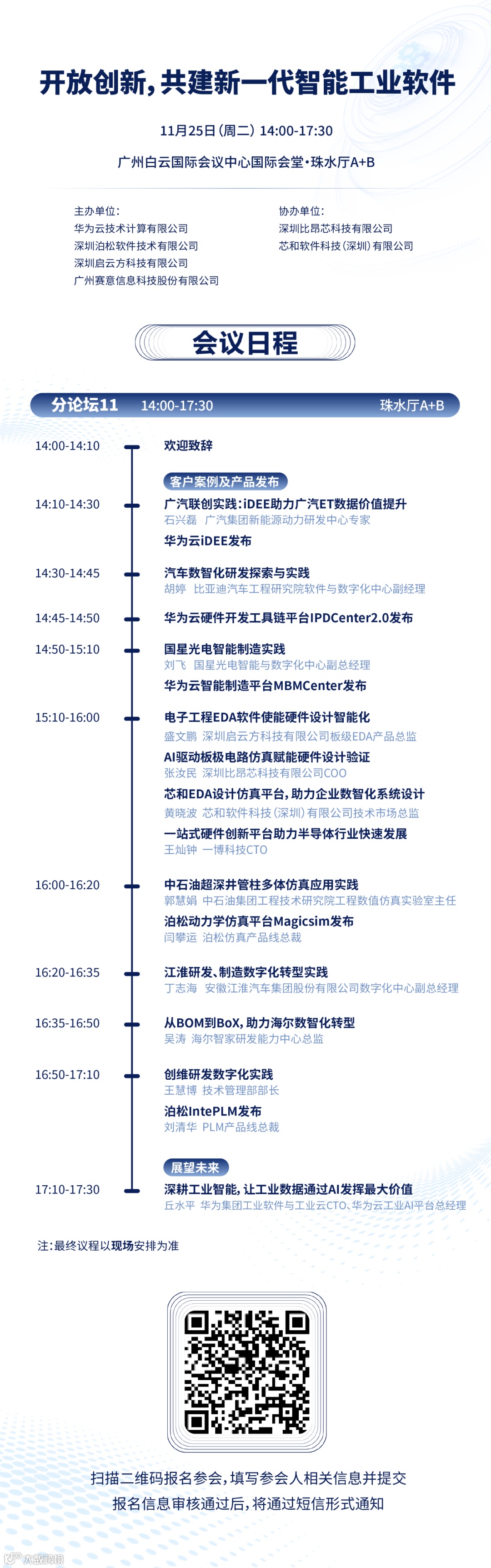 高峰论坛邀请函及报名入口如下,欢迎扫码注册参会,请选择“分论坛11:开放创新,共建新一代智能工业软件”。