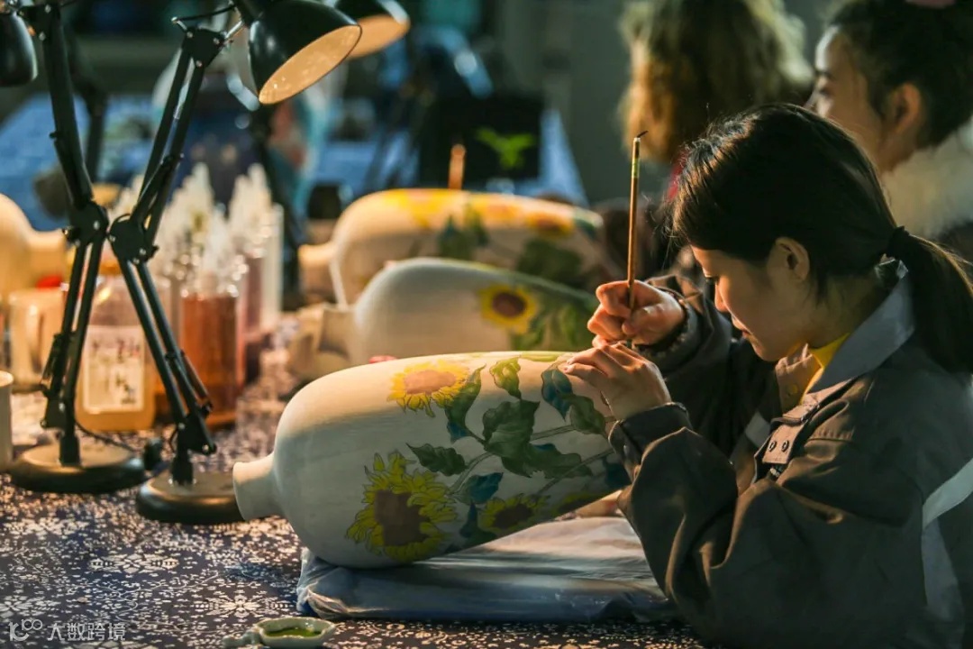 「为保证做到千万支酒瓶颜色一致,光是操作瓶子上的镶金培训时间至少需要3个月,每个瓶子瓶口的一圈金色都是在这里由工作人员用毛笔手工一笔一笔刻画上去,并且对瓶子的镶金宽度有非常严格的要求。」彩瓷车间主任张芬珂表示。