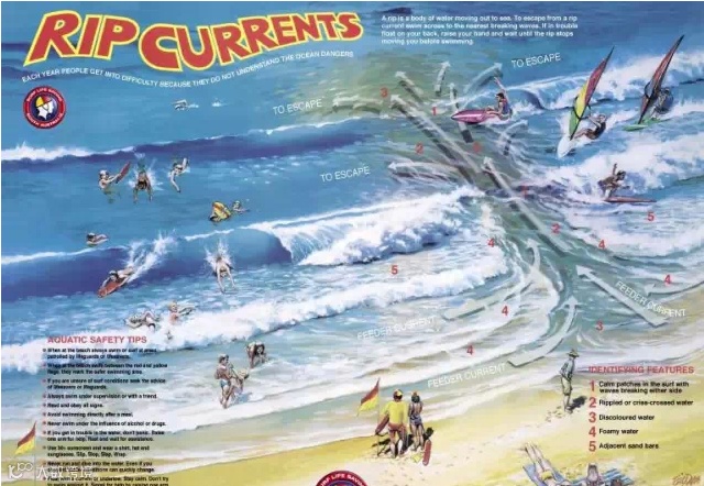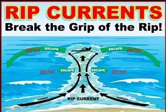 现在,再看这张离岸流逃生图,相信小伙伴们都能看懂了。由于离岸流变幻莫测,请记住海滩救生员的警告:“白浪边上的绿色海面很危险,避开它”。