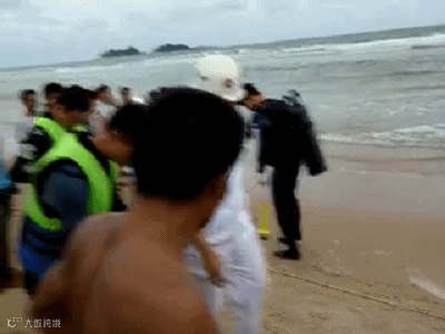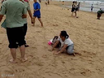 周围人员将母亲救上来了,但是很不幸,男孩没能救起来。被巨浪卷走的男童的母亲趴坐在沙滩上痛哭,声歇力竭。