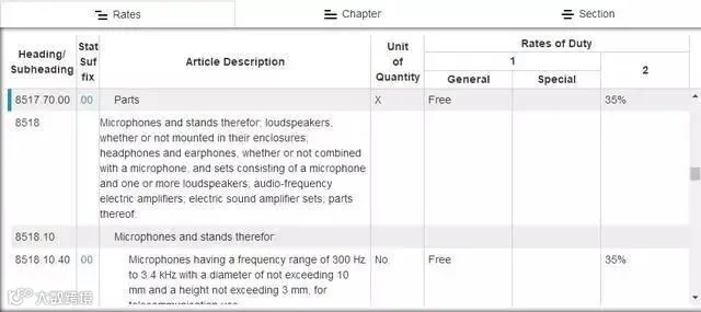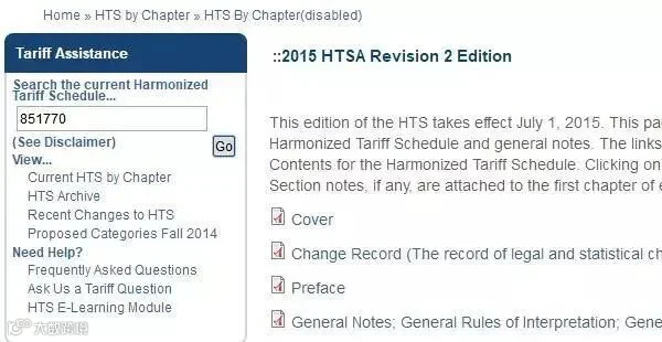 进入网站以后,在Tariff Assistance项下Search the current Harmonized Tariff Schedule...下的搜索框中输入产品的海关编码(HS CODE)。美国的HTS和我们的海关编码作用是一样的,而且前6位也是一致的。比如,我们输入手机的海关编码(HS CODE)的前6位851770,点击Go。