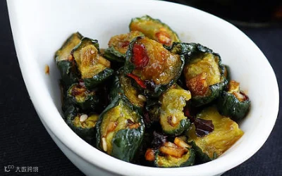 3、起油锅,小火炸香花椒和干辣椒,趁热浇在拌好的黄瓜条上,吃时拌匀。