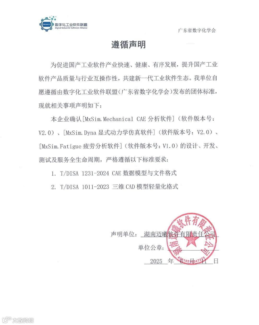 为促进国产工业软件产业快速、健康、有序发展,提升国产工业软件产品质量与行业互操作性,共建新一代工业软件生态,湖南迈曦软件有限责任公司自愿遵循由数字化工业软件联盟(广东省数字化学会)发布的《CAE数据模型与文件格式》标准、《三维CAD模型轻量化格式》标准并发布公开声明。具体内容如下: